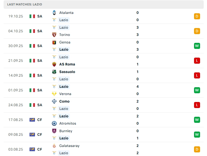 Lazio sau 7 trận đấu họ mang về 8 điểm cùng vị trí thứ 12 trên BXH, với chiến thắng 2 hòa, 2 hòa và 3 thất bại, ở vòng đấu gần nhất Lazio có trận hòa trước Atalanta, đây là trận bất bại thứ 3 liên tiếp với 1 chiến thắng cùng 2 hòa, trên sân nhà của mình Lazio chơi thiếu ổn định với 1 chiến thắng, 1 hòa cùng 1 thất bại sau 3 trận đấu.
