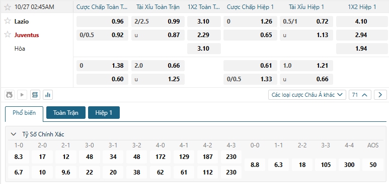Bảng tỷ lệ kèo bóng đá trận đấu Lazio vs Juventus