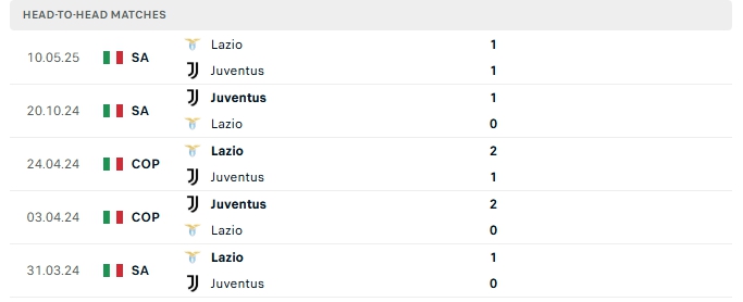 Những màn đụng độ giữa Lazio và Juventus thường diễn ra chặt chẻ với ít bàn thắng được tạo ra, cụ thể ở 4/5 lần gặp nhau gần nhất và 3/5 lần đón tiếp Juventus trên sân nhà của Lazio khép lại không quá 2 bàn.