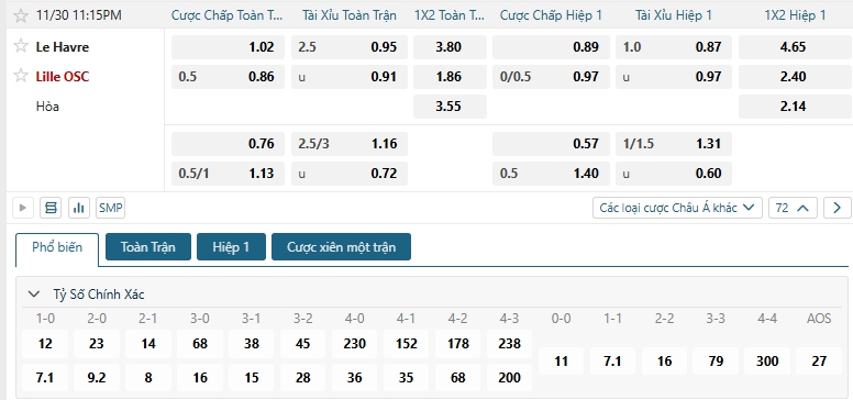 Bảng tỷ lệ kèo bóng đá trận đấu Le Havre vs Lille