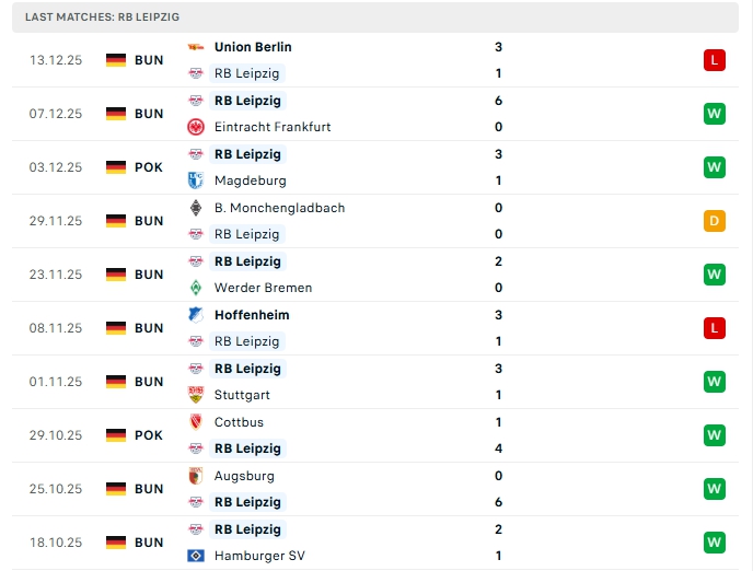 Leipzig sau 14 trận đấu, đội bóng này mang về 9 chiến thắng, 2 hòa cùng 3 thất bại, có được 29 điểm và đang xếp vị trí thứ 2 trên BXH, phong độ thời gian qua của Leipzig là tốt, ở vòng gần nhất Leipzig nhận thất bại 1-3 trước Union Berlin, họ chỉ để thua 1 ở 5 trận vừa qua trên mọi đấu trường, trên sân nhà Leipzig đang chơi ấn tượng với 9 trận bất bại liên tiếp với 7 chiến thắng, 1 hòa ở 8 trận gần nhất.