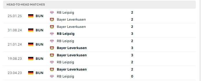 Những màn đụng độ giữa Leipzig và Bayer Leverkusen thường diễn ra hấp dẫn với nhiều bàn thắng được tạo ra, cụ thể ở 4/5 lần gặp nhau gần nhất của hai đội và 3/5 lần đón tiếp Bayer Leverkusen trên sân của Leipzig khép lại trên 3 bàn thắng.