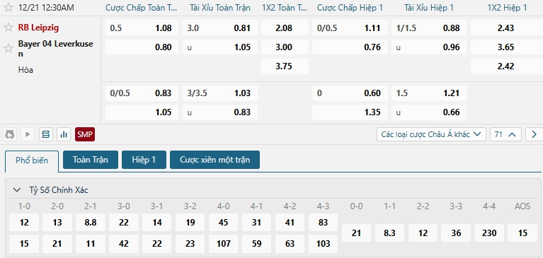 Bảng tỷ lệ kèo bóng đá trận đấu Leipzig vs Bayer Leverkusen