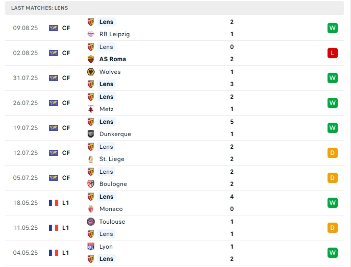Lens mùa giải trước (2024/25) thi đấu tại Ligue 1 và kết thúc ở vị trí thứ 8 trên bảng xếp hạng, với 52 điểm sau 34 trận, hàng công mang về 42 bàn thắng cùng hàng thủ nhận 39 bàn thua, để chuẩn bị cho mùa giải mới, Lens có cho mình 7 trận giao hữu, với hàng công có được 16 bàn thắng, cùng hàng thủ nhận 10 bàn thua, 6/7 trận đấu đó khép lại từ 3 bàn trở lên và 4/5 trận trên sân nhà cũng có kết quả tương tự.