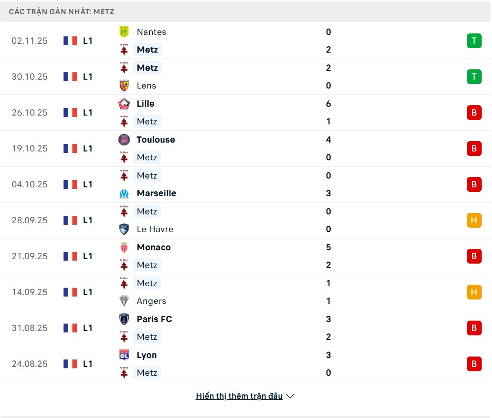 Metz hiện ngụp lặn ở nhóm cuối bảng khi mới giành được 2 chiến thắng, 2 trận hòa và nhận tới 7 thất bại. Hàng công của họ mới ghi được 10 bàn, trong khi hàng thủ thủng tới 26 lần – con số phản ánh rõ sự mong manh. 3/5 trận gần nhất của Metz đều nổ tài, bởi họ thường xuyên bị cuốn vào thế trận rượt đuổi.