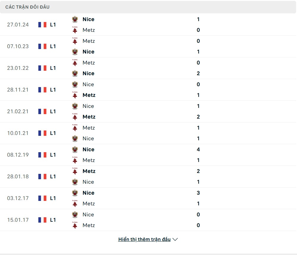 Lịch sử đối đầu của Metz vs OGC Nice