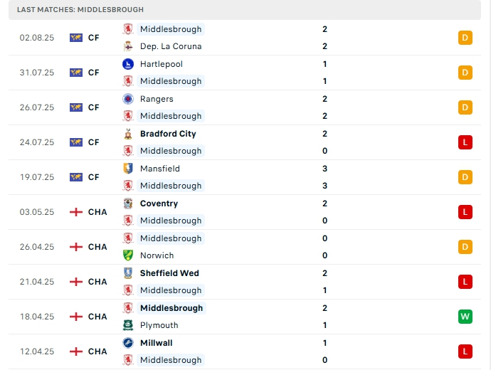 Middlesbrough kết thúc mùa giải 2024–25 ở vị trí thứ 10 trên bảng xếp hạng Championship với 64 điểm sau 46 trận đấu, không giành được vé vào vòng Palyoff, ở mùa giải năm nay Middlesbrough đang có sự chuẩn bị kỹ lưỡng với 6 trận giao hữu vừa qua, trong đó hàng công mang về 8 bàn thắng, cùng hàng thủ nhận 10 bàn thua, điểm yếu của Middlesbrough vẫn đến từ nơi hàng thủ, họ cần khắc phục sớm trước khi mùa giải khởi tranh.