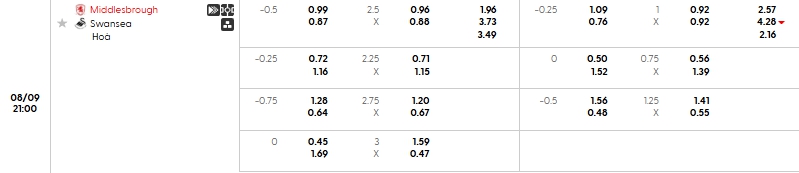 Bảng tỷ lệ kèo bóng đá trận đấu Middlesbrough vs Swansea City