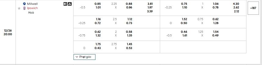 Nhà cái châu Á đang đánh giá cao khả năng chiến thắng của các vị khách Ipswich, khi đưa ra mức chấp đang là 0.5, dù phải làm khách nhưng Ipswich đang là đội bóng có thực lực tốt, Ipswich cũng đang có phong độ tốt, trong khi Millwall không được đánh giá cao về thực lực, họ sẻ gặp khó trước đối thủ, lựa chọn Ipswich cho kèo châu Á.
