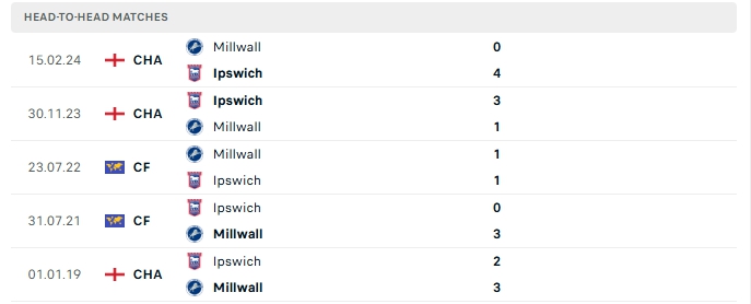 Những màn đụng độ giữa Millwall và Ipswich thường diễn ra hấp dẫn với nhiều bàn thắng được tạo ra, cụ thể ở 4/5 lần gặp nhau gần nhất của hai đội và 4/5 lần đón tiếp Ipswich trên sân của Millwall khép lại trên 3 bàn thắng.