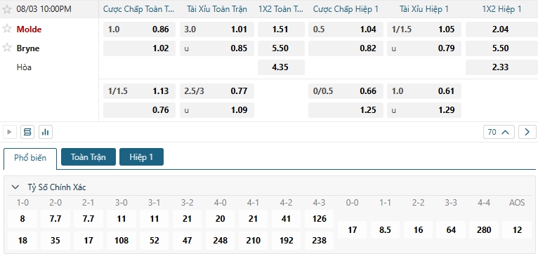 Bảng tỷ lệ kèo bóng đá trận đấu Molde vs Bryne