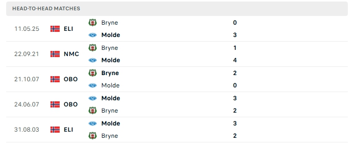 Lịch sử đối đầu của Molde vs Bryne