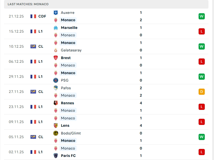 Monaco sau 16 trận đấu họ có được 7 chiến thắng và 2 hòa và 7 thất bại, mang về 23 điểm và đang xếp ở vị trí thứ 9 trên BXH, Monaco ở vòng đấu gần nhất họ nhận thất bại 0-1 trước Marseille, phong độ thời gian qua của Monaco là thiếu ổn định, dù vậy trên sân nhà ở sân chơi Ligue Monaco đang chơi tốt với 5 chiến thắng, 1 hòa và 2 thất bại sau 8 trận đấu.