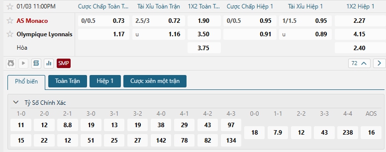 Bảng tỷ lệ kèo bóng đá trận đấu Monaco vs Lyon