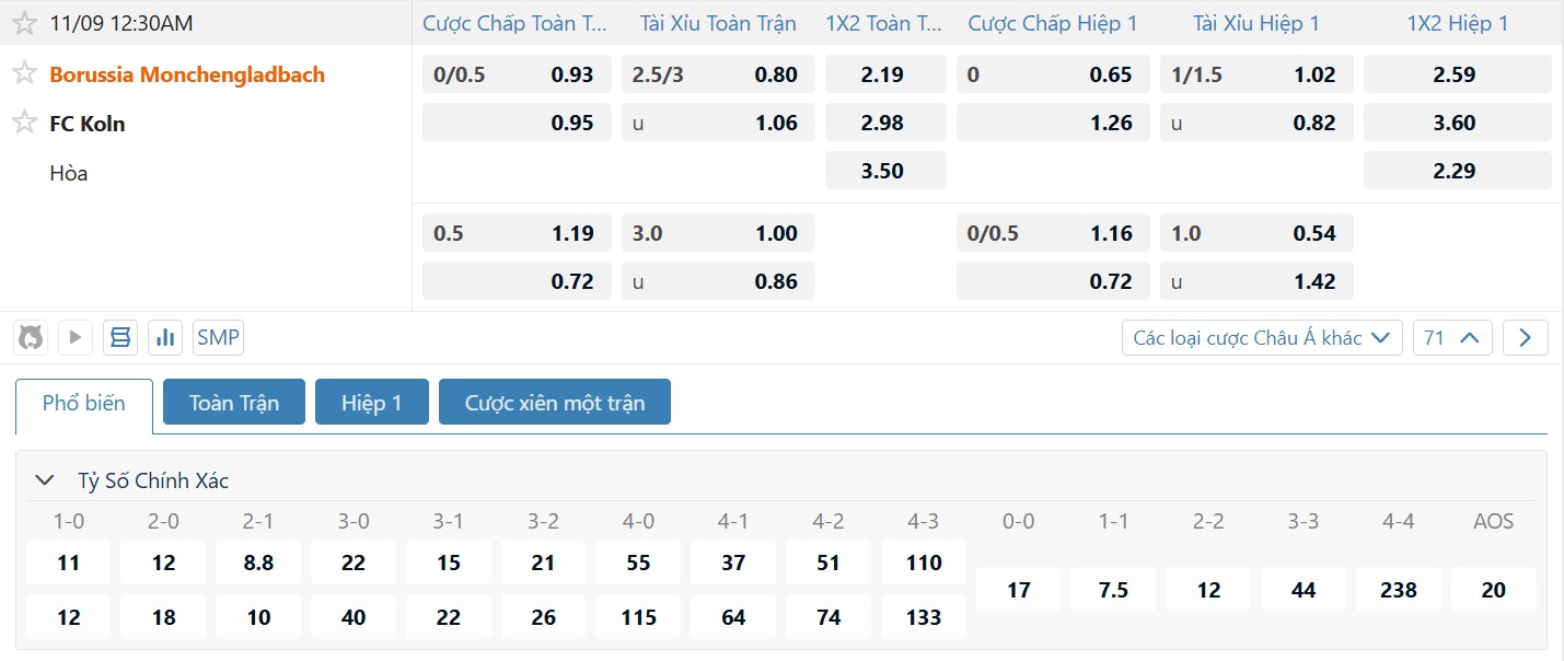 Bảng tỷ lệ kèo bóng đá trận đấu Monchengladbach vs FC Koln