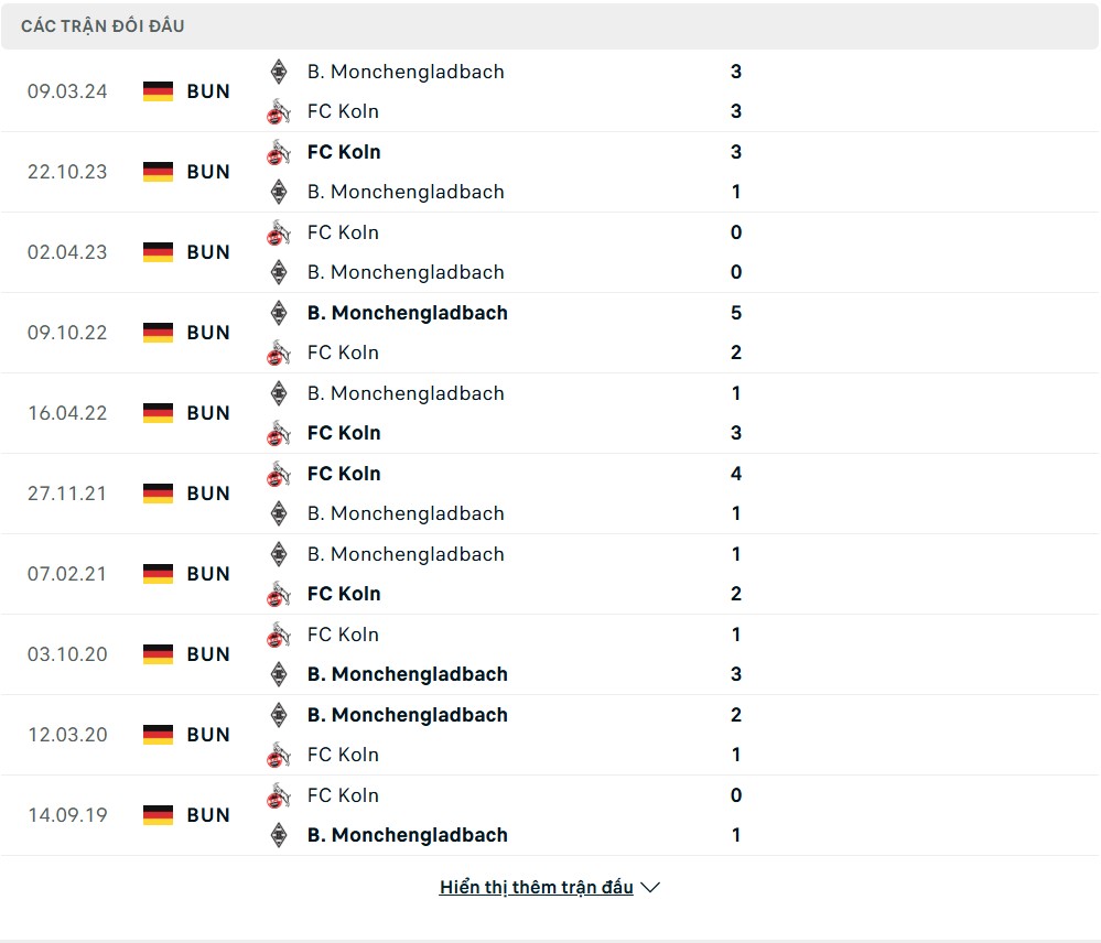 Lịch sử đối đầu của Monchengladbach vs FC Koln