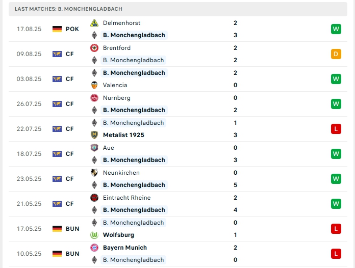 Monchengladbach có sự chuẩn bị kỹ lưỡng cho mùa giải mới, họ mang về 7 trận giao hữu, trong đó hàng công ghi dấu ấn với 19 bàn thắng cùng hàng thủ nhận 7 bàn thua, 5/7 trận đấu đó khép lại 90 phút từ 3 bàn thắng trở lên, ở trận đấu chính thức vừa qua Monchengladbach cùng mang về 3 bàn thắng trong chiến thắng 3-2 trước Delmenhorst ở đấu trường Cup. 3/5 trận sân nhà gần nhất của Monchengladbach cũng vượt mốc trên 3 bàn.