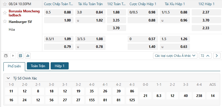 Nhà cái châu Á đang đánh giá cao khả năng chiến thắng của các cầu thủ chủ nhà Monchengladbach khi đưa ra mức chấp đang là 0.5, xét về thực lực thì rỏ ràng Monchengladbach được đánh giá cao hơn so với Hamburger đội vừa mới thăng hạng, với ưu thế sân nhà Monchengladbach sẻ hướng đến kết quả tốt và trước một đối thủ đang có phong độ không tốt là cơ hội để Monchengladbach có được chiến thắng ở ngày khai màn, lựa chọn Monchengladbach cho kèo Châu Á.