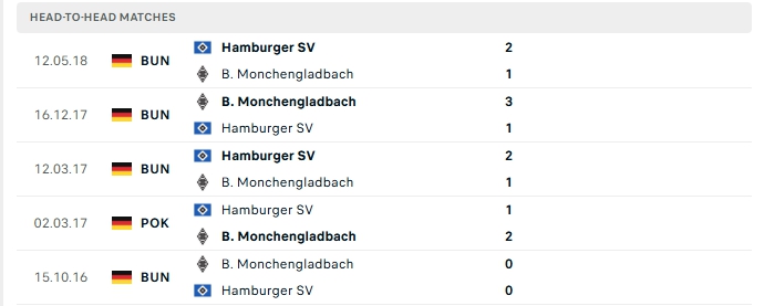 Những màn đụng độ giữa Monchengladbach và Hamburger thường diễn ra hấp dẫn với nhiều bàn thắng được tạo ra, 4/5 lần gặp nhau gần nhất của hai đội và 2/3 lần đón tiếp Hamburger trên sân của Monchengladbach khép lại từ 3 bàn trở lên.