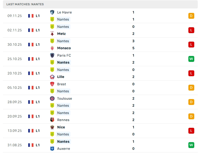 Nantes sau 12 trận đấu họ có được 2 chiến thắng, 4 hòa và 6 thất bại, mang về 10 điểm và đang xếp ở vị trí thứ 16 trên BXH, một vị trí trong nhóm cầm đèn đỏ, phong độ thời gian qua của Nantes là không tốt khi họ chỉ thắng 1 ở 9 trận liên tiếp gần nhất, trong đó có đến 4 thất bại cùng 4 hòa, trên sân nhà của mình Nantes cũng chỉ thắng 1 ở 5 trận gần nhất với 2 hòa cùng 3 thất bại.