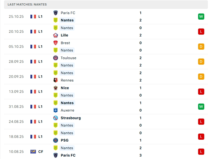 Nantes ở vòng đấu gần nhất họ có chiến thắng trước Paris FC, chiến thắng này chấm dứt chuỗi 5 trận trước đó không thắng, sau 9 lượt trận Nantes có cho mình 2 chiến thắng, 3 hòa cùng 4 thất bại, có được 9 điểm và đang xếp vị trí thứ 13 trên BXH, phong độ thời gian qua của Nantes là không tốt, dù vừa có được chiến thắng nhưng trước đó họ trải qua chuỗi thất vọng, trên sân nhà Nantes cũng đang chơi tệ khi thắng 1, hòa 1 và thua 3 ở 5 trận gần nhất.