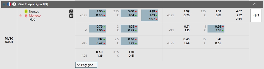 Bảng tỷ lệ kèo bóng đá trận đấu Nantes vs Monaco
