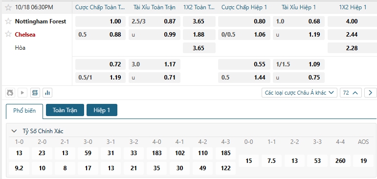 Bảng tỷ lệ kèo bóng đá trận đấu Nottingham Forest vs Chelsea