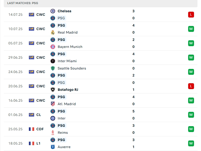 PSG là đại diện đến từ Pháp, đội bóng này có một mùa giải ấn tượng khi đánh bại Inter Milan trong trận chung kết với tỷ số 5-0 để có danh hiệu Champions League mùa giải vừa qua, hàng công đang là điểm mạnh của PSG, ở đấu trường Club World Cup vừa qua họ cũng lọt vào tới chung kết, 3/5 trận vừa qua của PSG khép lại 90 phút từ 3 bàn thắng trở lên, với lối chơi thiên về tấn công thì trận đấu tới sẻ là kịch bản đầy hứa hẹn.
