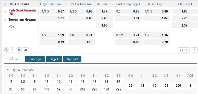 Nhà cái Châu Á đang đánh giá khả năng chiến thắng của PSG là cao hơn nhiều so với đối thủ, khi đưa ra mức chấp 1.25, PSG đang sở hữu lực lượng đồng đều, sức mạnh đến từ các tuyến và lối chơi kiểm soát bóng ấn tượng, họ được dự đoán sẻ kiểm soát thế trận và tấn công ngay từ tiếng còi khai cuộc, Tottenham sẻ gặp nhiều khó khăn và sẻ không dễ để triển khai bóng, lựa chọn PSG cho trận đấu này.