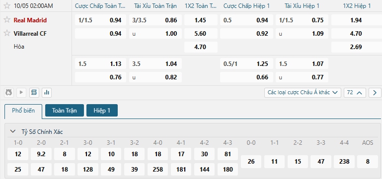 Bảng tỷ lệ kèo bóng đá trận đấu Real Madrid vs Villarreal