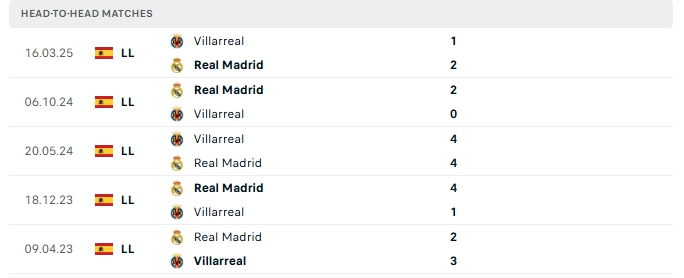 Những màn đụng độ giữa Real Madrid và Villarreal thường diễn ra hấp dẫn với nhiều bàn thắng, 4/5 lần gặp nhau gần nhất của hai đội và 3/5 lần đón tiếp Villarreal trên sân của Real Madridkhép lại trên 3 bàn.