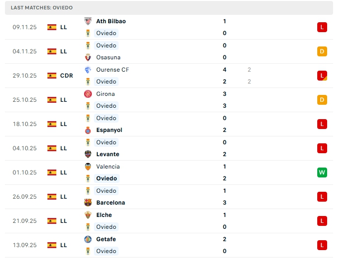 Real Oviedo  sau 12 trận đấu, đội bóng này mang về 2 chiến thắng, 2 hòa và nhận 8 thất bại, có được 8 điểm và đang xếp cuối cùng trên BXH, ở vòng đấu gần nhất Real Oviedo nhận thất bại 0-1 trước Ath Bilbao, thất bại này nối dài chuỗi 6 trận không biết mùi chiến thắng, trong đó có 2 hòa cùng 4 thất bại, trên sân nhà Real Oviedo cũng đang chơi tệ với 4 trận không thắng gần nhất trong đó có 3 thất bại.