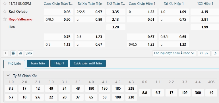 Bảng tỷ lệ kèo bóng đá trận đấu Real Oviedo vs Rayo Vallecano
