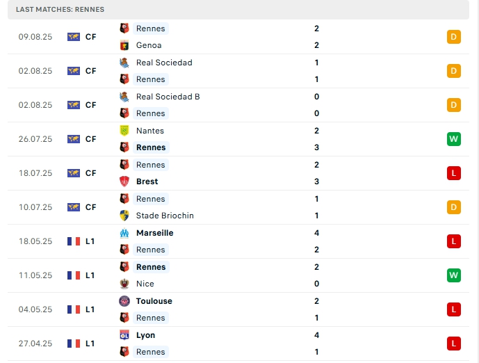 Rennes mùa giải trước (2024/25) thi đấu tại Ligue 1 và kết thúc ở vị trí thứ 12 trên bảng xếp hạng, với 41 điểm sau 34 trận, hàng công mang về 51 bàn thắng cùng hàng thủ nhận 50 bàn thua, để chuẩn bị cho mùa giải mới, Rennes mang về 6 trận giao hữu, với hàng công có được 9 bàn thắng, cùng hàng thủ nhận 9 bàn thua, trên sân nhà của mình ở 3/5 trận vừa qua khép lại từ 3 bàn trở lên.