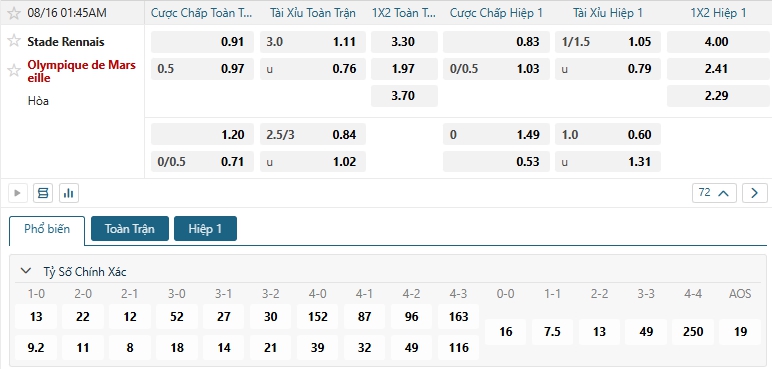 Bảng tỷ lệ kèo bóng đá trận đấu Rennes vs Marseille