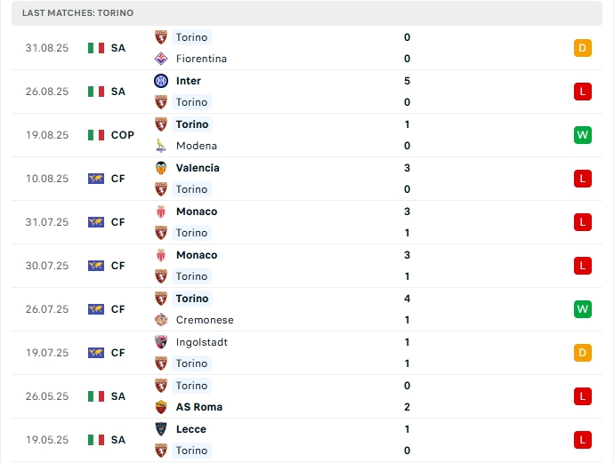 Torino sau 2 trận đấu này, đội bóng này chưa có được bàn thắng nào, cùng hàng thủ nhận 5 bàn thua, 2/3 trận vừa qua của Torino khép lại không quá 2 bàn, khi thi đấu xa nhà Torino đang chơi tệ nơi hàng thủ, họ cần sớm cải thiện phong độ nếu không muốn tiếp tục đón nhận thất bại.