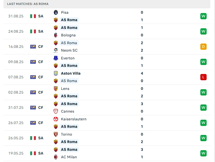 Roma sau 2 trận đấu họ mang về 6 điểm với 2 chiến thắng, ở ngày ra quân Roma có chiến thắng trước Bologna, sau đó họ tiếp tục có 3 điểm trước Pisa, 6 điểm có được cùng vị trí thứ 4 trên BXH, phong độ thời gian qua của Roma là tốt, đội bóng này chỉ nhận 1 thất bại trong 10 trận gần nhất, trong đó thắng 8 và hòa 1, trên sân nhà của mình Roma đang chơi tốt khi bất bại ở 20 trận liên tiếp với 17 chiến thắng cùng 3 hòa.
