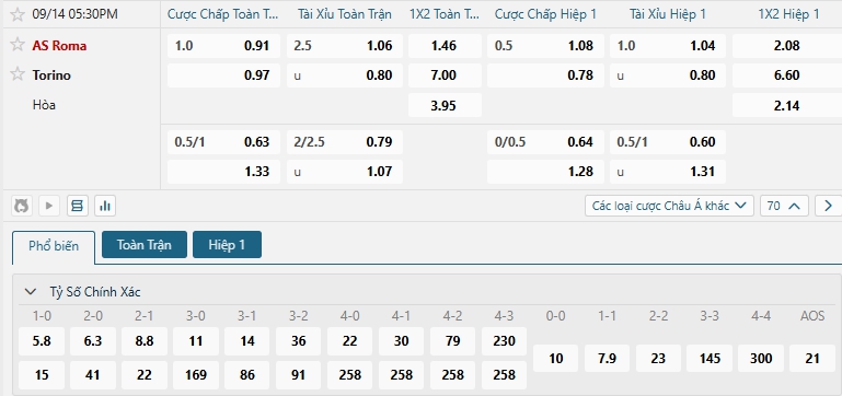 Bảng tỷ lệ kèo bóng đá trận đấu Roma vs Torino