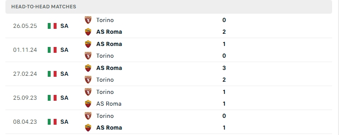 Những màn đụng độ giữa Roma và Torino thường diễn ra chặt chẻ với ít bàn thắng được tạo ra, 4/5 lần gặp nhau gần nhất của hai đội và 3/5 lần đón tiếp Torino trên sân của Roma khép lại không quá 2 bàn.