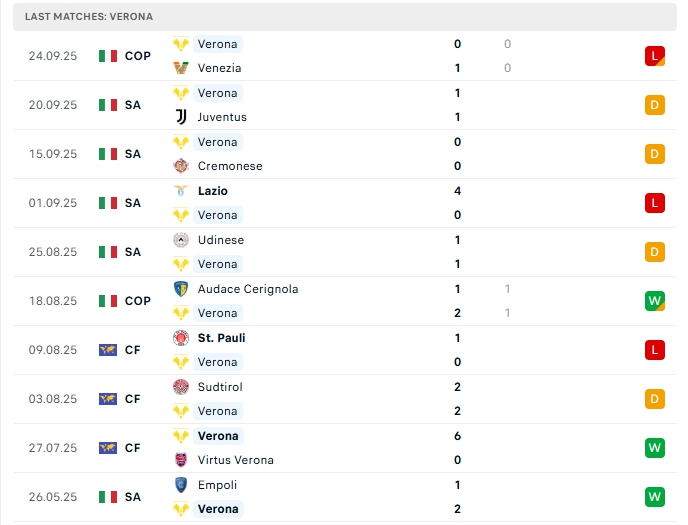 Phong độ gần đây Roma vs Verona