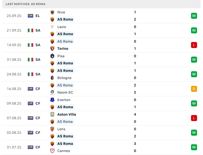 Roma sau 4 trận đấu, đội bóng này mang về 3 bàn thắng cùng hàng thủ chắc chắn khi chỉ nhận 1 bàn thua, hàng thủ chơi chắc chắn nên những trận đấu của Roma có xu hướng ít bàn thắng, 4 trận ở Serie A vừa qua khép lại không quá 2 bàn, trên sân nhà ở 2 trận vòng đấu gần nhất cũng tương tự.