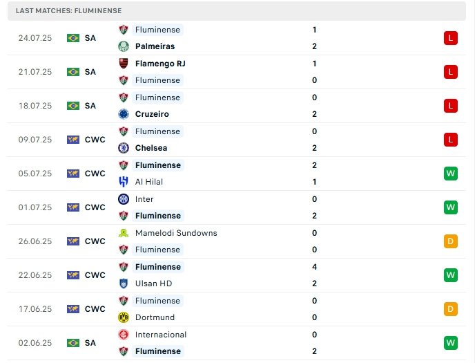 Fluminense sau 14 trận đấu họ mang về 16 bàn thắng cùng với hàng thủ nhận 17 bàn thua, lối chơi của Fluminense thiên về phòng ngự chủ động, nên những trận đấu có sự góp mặt của đội bóng này đều có ít bàn thắng được tạo ra, 3/5 trận gần nhất của họ và 4/5 trận xa nhà vừa qua đều khép lại 90 phút không quá 2 bàn.