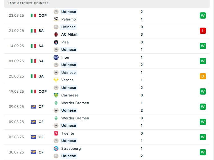 Udinese sau 4 trận đấu này, đội bóng này mang về 4 bàn thắng cùng hàng thủ nhận 5 bàn thua, 3/5 trận vừa qua của Udinese khép lại từ 3 bàn trở lên, lối chơi của Udinese cũng đang khá cởi mở, họ không quá chắc chắn nơi hàng thủ, dù vậy khi xa nhà Udinese thường nhập cuộc chậm và chắc chắn.