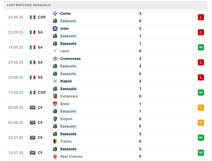 Sassuolo sau 4 trận đấu họ mang về 3 điểm cùng vị trí thứ 14 trên BXH, với 1 chiến thắng,và 3 thất bại, ở ngày ra quân Sassuolo nhận thất bại trước Napoli, sau đó họ tiếp tục nhận thất bại 2-3 trước Cremonese, Sasuolo bất ngờ đánh bại Lazio ở vòng 3, nhưng ngay lập tức trở lại mặt đất khi thua 1-2 trước Inter Milan ở vòng vừa qua, phong độ thời gian qua của Sassuolo là không tốt khi thua đến 4 trong 5 trận gần nhất, dù vậy trên sân nhà của mình Sassuolo chơi hay khi thắng 4, thua 1 ở 5 trận đã qua.