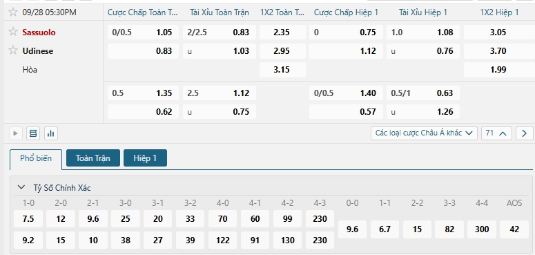 Nhà cái châu Á đang đánh giá cao khả năng chiến thắng của chủ nhà Sassuolo , khi đưa ra mức chấp đang là 0.25, dù vậy sẻ không hề dễ dàng để Sassuolo có được chiến thắng khi nhìn vào những màn trình diễn tệ hại vừa qua, trong khi Udinese lại đang có được sự tự tin với những trận đấu tốt và cũng đang chơi cực hay khi xa nhà, 90 phút sắp tới nên đặt niềm tin vào Udinese sẻ an toàn hơn, lựa chọn Udinese cho kèo châu Á.