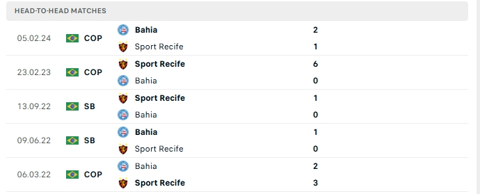 Những màn đụng độ giữa SC Recife và Bahia thường diễn ra hấp dẫn với nhiều bàn thắng được tạo ra, 3/5 lần gặp nhau gần nhất của hai đội khép lại 90 phút từ 3 bàn thắng trở lên.