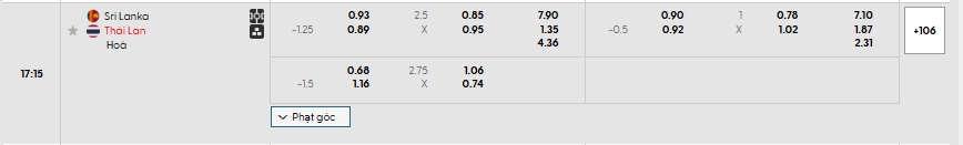 Bảng tỷ lệ kèo bóng đá trận đấu Sri Lanka vs Thái Lan