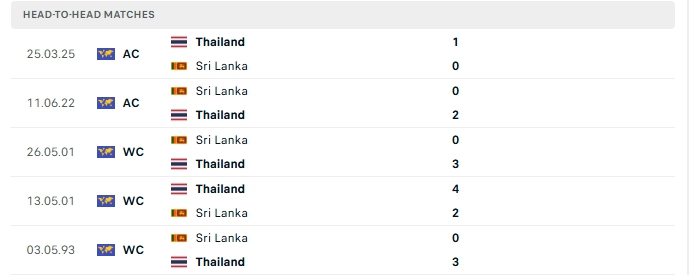 Lịch sử đối đầu của Sri Lanka vs Thái Lan