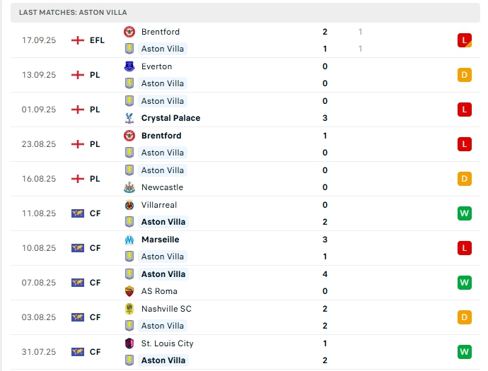 Aston Villa ở 4 lượt trận đầu tiên đội bóng này chưa có bàn thắng nào cùng hàng thủ nhận 4 bàn thua, Aston Villa đang gây thất vọng lớn ở 4 vòng vừa qua, khi thi đấu xa nhà ở 5 trận gần nhất thì 3 trận họ đều để các đối thủ chọc thủng lưới, hàng thủ đang chơi tệ khiến Aston Villa gặp nhiều khó khăn.