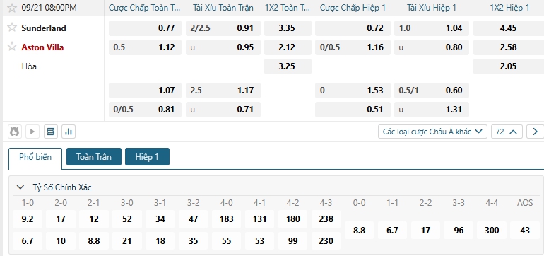 Bảng tỷ lệ kèo bóng đá trận đấu Sunderland vs Aston Villa